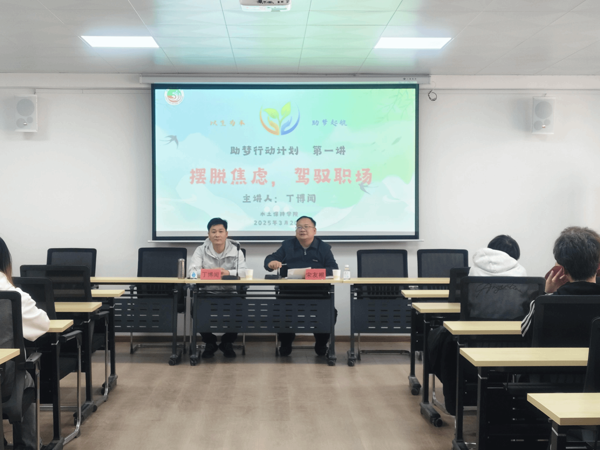 3月20日下午,水土保持学院在逸夫水利楼B210开展“助梦行动计划” 第一讲,邀请江西大通技术咨询有限公司总经理丁博闻做“摆脱焦虑,驾驭职场”的经验分享。学院分管就业工作的领导、辅导员及60余名学生聆听了讲座。