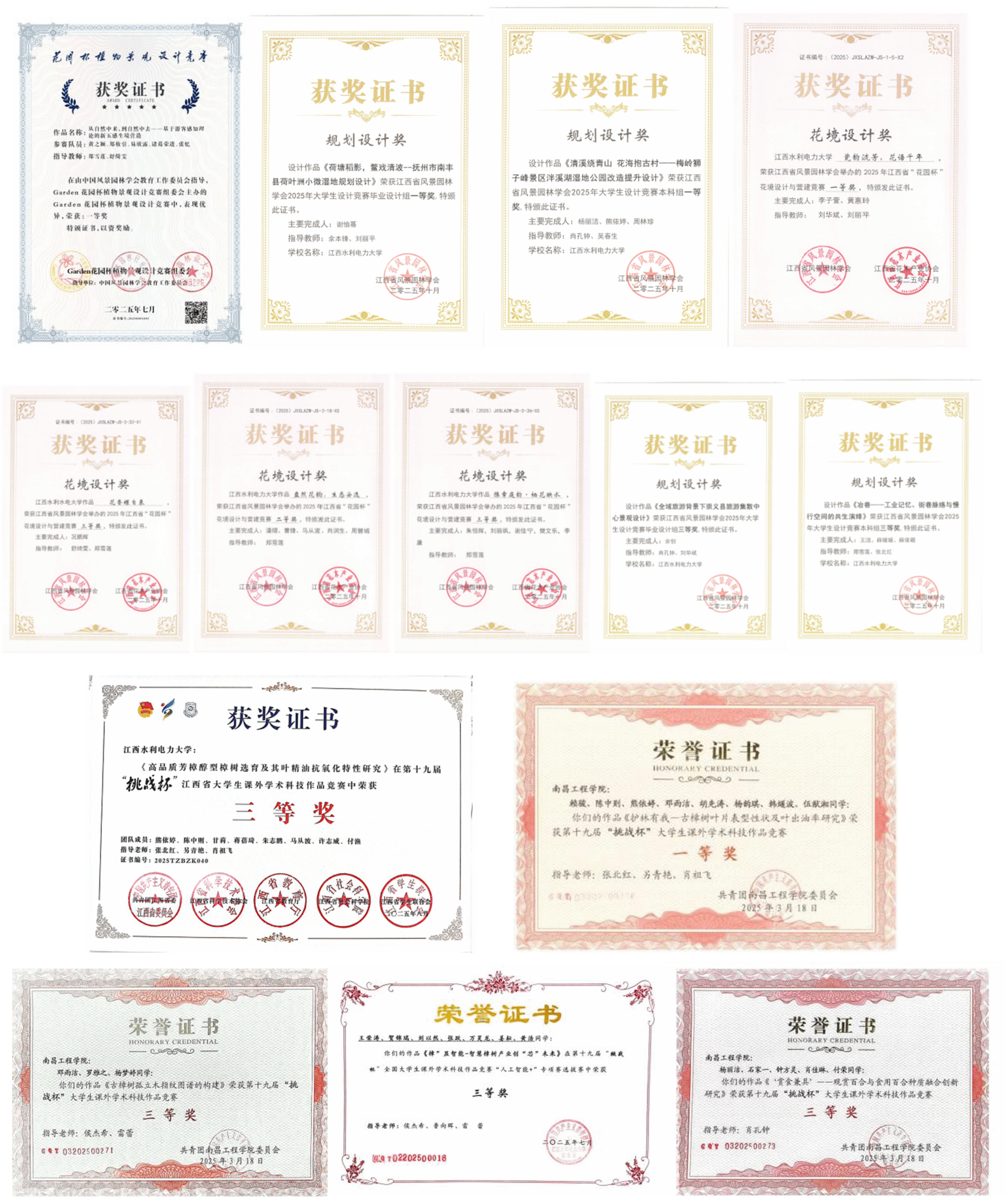 据不完全统计,截至2025年11月,我院园林学子共获国家级一等奖1项,省级一等奖3项、二等奖1项、三等奖5项及校级一等奖1项等多个奖项。学院高度重视学科竞赛,园林教研室对园林、风景园林专业参赛学生给予了悉心指导,竞赛涉及植物景观设计、湿地公园规划、花境营建、植物资源研究等多个方向,形成了层次分明、结构完善的育人成果体系,也反映了学院在课程改革、实践教学和科研育人方面的扎实成效。