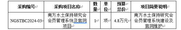 南方水土保持研究会会员管理系统及官网项目潜在供应商应在南昌工程学院水土保持学院(南昌工程学院逸夫楼B403室)获取采购文件,并于2024年7月26日9点30分(北京时间)前提交响应文件。